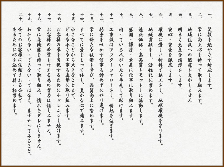 | 営業品目 | 大工工事、塗装工事、屋根工事、内装工事、基礎工事、耐震工事、増改築工事、インテリア用品販売・施工、建具工事、住宅設備機器販売・施工、畳・障子・網戸工事、左官・タイル工事、防水工事、室内クリーニング、給排水・給湯工事、エアコン取付工事、サッシ・ガラス工事、防音工事、太陽光・風力工事、新築工事、防犯工事 |